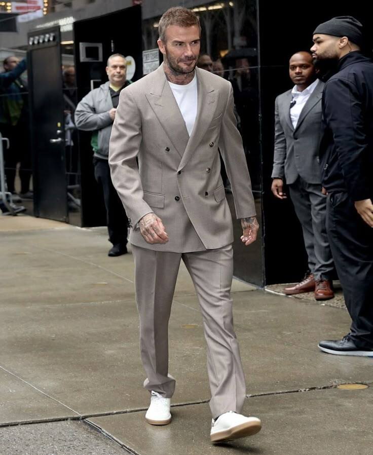 Дэвид Бекхэм в светло-сером двубортном костюме, который стилизован с обычной футболкой и кедами
