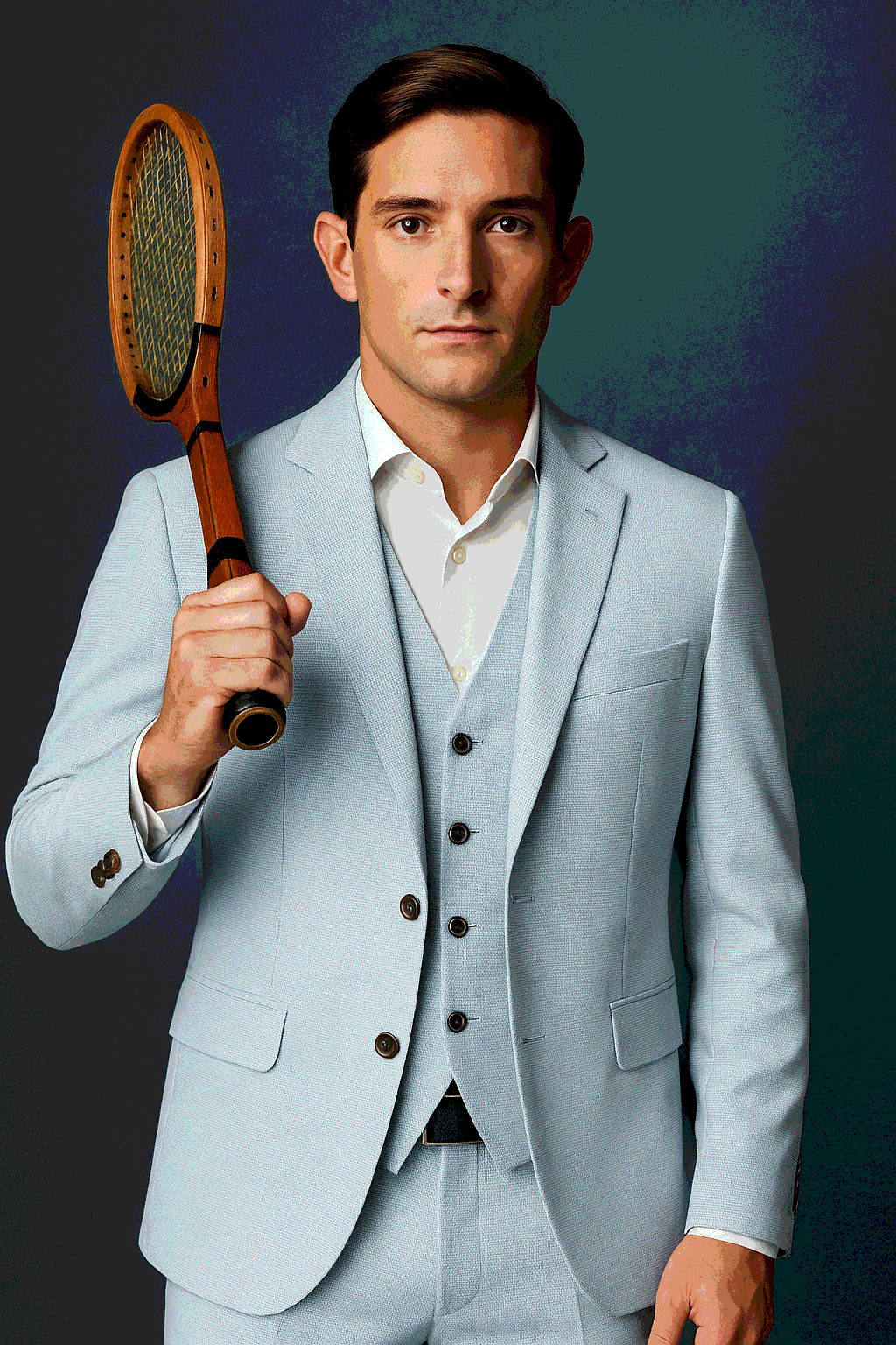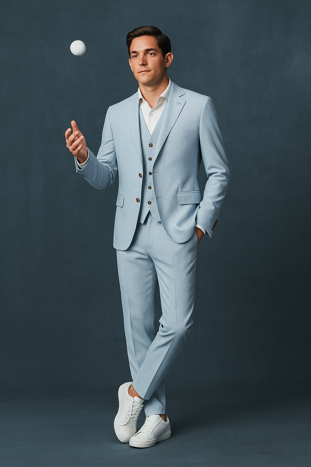 Небесно-голубой костюм – выбор для тех, кто не боится ничего нового. Светло-голубой пиджак с брюками сразу выделяют вас из толпы строгих темных троек. Такой оттенок ассоциируется с молодостью и свежестью, он как летнее небо – поднимает настроение и собирает взгляды окружающий. При этом голубой костюм удивительно универсален: его можно надеть на дневное мероприятие без галстука, и вы будете выглядеть одновременно элегантно и расслабленно. Попробуйте дополнить образ белыми кедами – и получите стиль smart casual из модных журналов. В жару небесно-голубой лен особенно уместен: даже на вид кажется прохладнее! И будьте уверены, окружающие точно отметят про себя, как вам идет этот костюм, как он на вас смотрится.