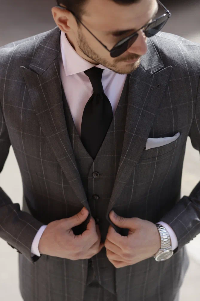 Серый костюм в клетку – для любителей классики с изюминкой. Серая ткань с клетчатым узором (например, принт «принц Уэльский» или выразительная окнообразная клетка) – это одновременно дань традиции и проявление индивидуальности. В таком костюме вы демонстрируете внимание к деталям. Клетка разбавляет строгость серого, добавляя динамики образу. Такой вариант хорош для деловых встреч, когда хочется выглядеть стильно, но не скучно. Серый – цвет нейтральный, а клетка придаёт шарм, так что в таком костюме себя легко представить и в переговорной, и на вечеринке. К тому же клетчатый пиджак потом легко «подружится» с джинсами или однотонными брюками в повседневном образе. Универсальность – второе имя серого костюма, а клетка делает его запоминающимся.